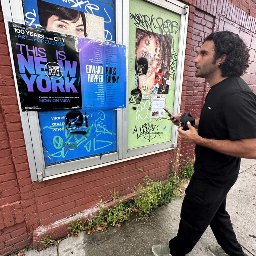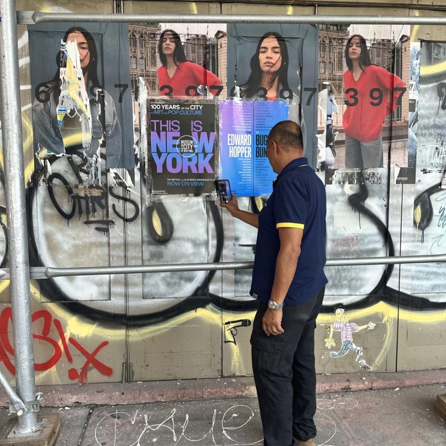 Man stops to use QR code on wild postings for the exhibition This Is New York.
