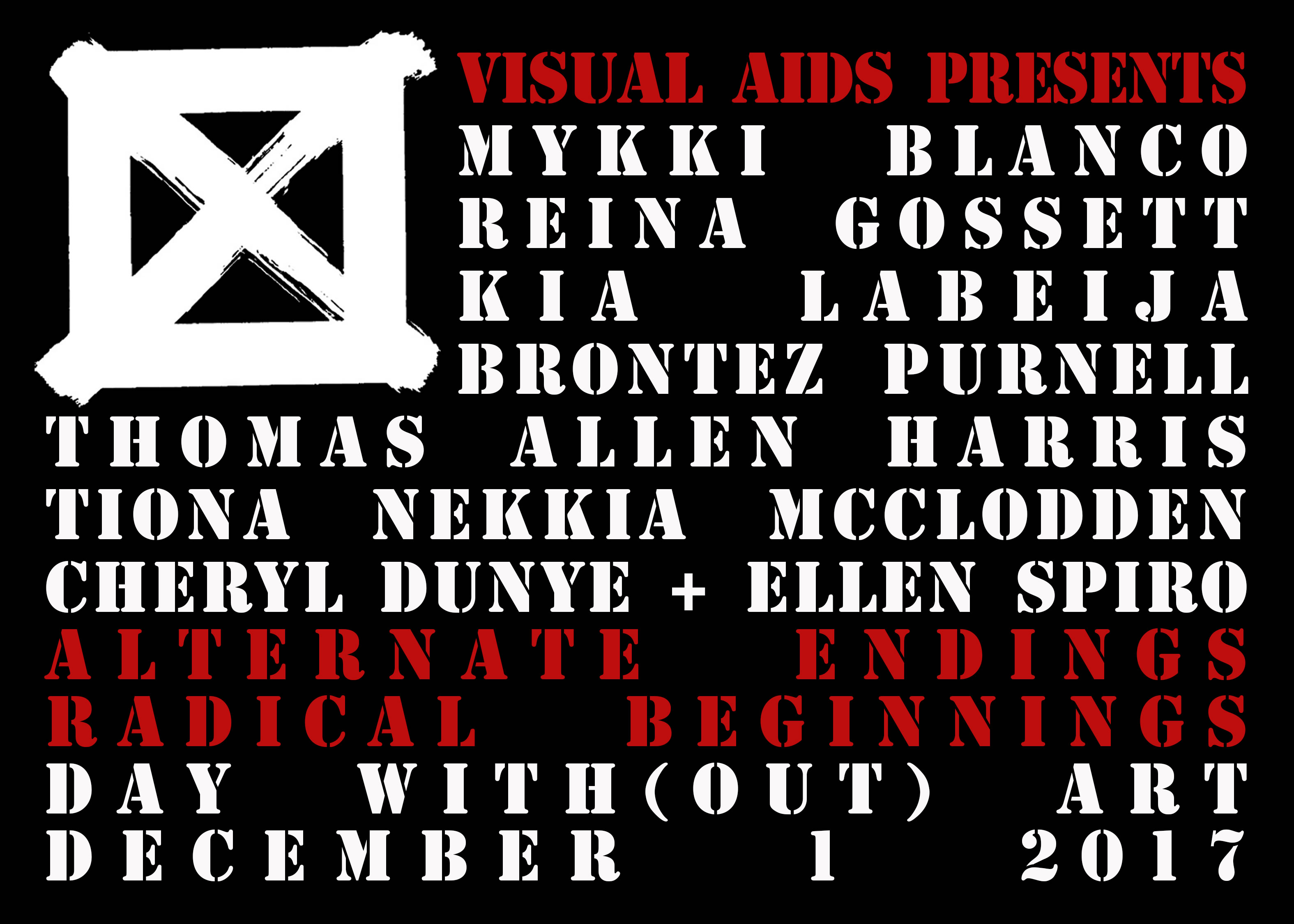 In response to the worsening AIDS crisis and coinciding with the World Health Organization’s second annual World AIDS Day on December 1, Visual AIDS organized the first Day Without Art. The annual event has since initiated numerous projects that included: A Night Without Light (the dimming of the New York skylight), the Electric Blanket (a nationwide outdoor slide projection with text and images), and Positive Actions (an exhibition-competition for a television PSA held simultaneously in three NYC venues), among others. Since 2010, Visual AIDS has worked with artists and filmmakers to internationally distribute videos to museums, art institutions, schools and AIDS organizations, including this year's film, ALTERNATE ENDINGS, RADICAL BEGINNINGS. For more information on Day With(out) Art, click here.
