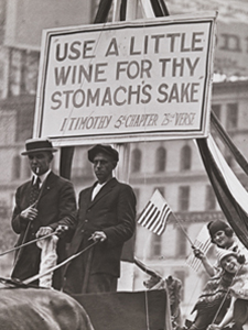 On July 4, 1921, thousands of New Yorkers marched up Fifth Avenue in one of the earliest protests against Prohibition. Organized by the American Liberties League, the parade included German, Irish, and African-American groups; veterans; and Mayor John Francis Hylan. The biblical quotation on the parade float, while presented in a humorous way, illustrates the debate during Prohibition over using alcohol for medicinal purposes. Opponents also differed over the use of sacramental wine by religious groups.