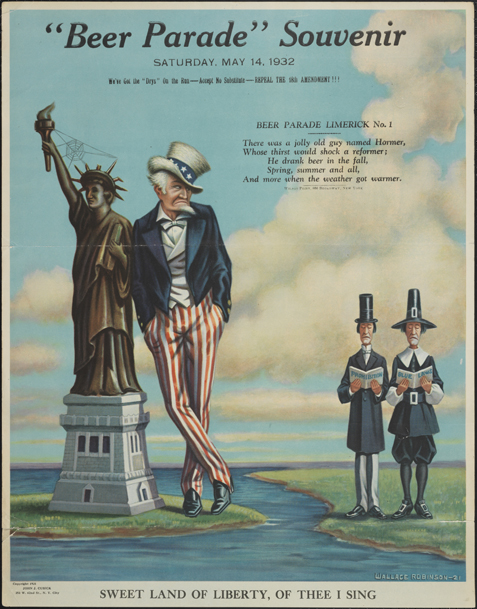 On May 14, 1932, 100,000 New Yorkers marched down Fifth Avenue in objection to the 18th amendment with signs stating “We Want Beer” and “We Prefer Brewers of Beer to Brewers of Bigotry.” Mayor James “Jimmy” Walker, a longtime Prohibition opponent, had organized the “Beer for Taxation” parade, opining that legalizing beer would create tax revenue and jobs. This poster from the parade mocks temperance supporters and suggests that Prohibition infringed on liberty itself.
