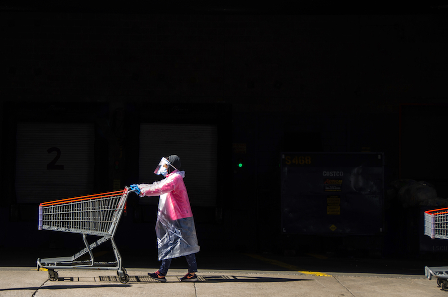 A woman in a face shield and plastic coat-like covering pushes a shopping cart.
